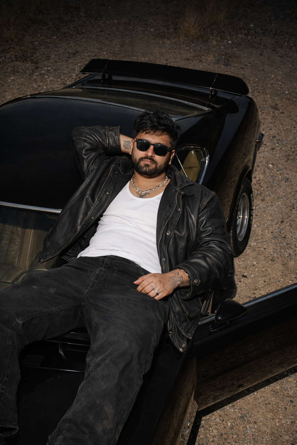ULTRA-REALISTIC 8K PORTRAIT of a stylish young man [ keep it real face from uploaded image] A high-angle, realistic photograph of a young man lying relaxed on the hood of a vintage glossy black muscle car at night. The man with a voluminous, messy dark wavy hair and a clean taper fade on the sides and tattoos on his forearm, is wearing a vintage, oversized dark leather jacket over a white ribbed tank top, paired with black baggy jeans and black leather boots. He is accessorized with a silver and pearl mixed necklace and multiple silver rings on his fingers, rectangular sunglasses. One of his arms is resting behind his head. The driver’s side door of the car is open, revealing a tan leather interior. The car has a rear spoiler and white-letter tires. The setting is a dry, arid landscape with gravel, dirt, and sparse dry vegetation. The lighting style is direct camera flash photography, giving the image a fashion editorial look with an earthy color palette.