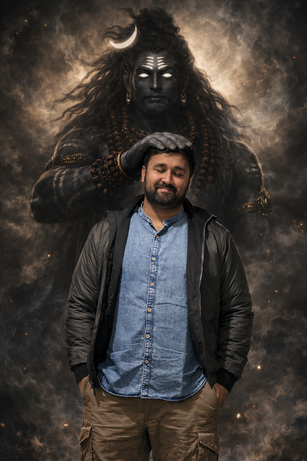 A Uploaded image Transform the uploaded photo into a hyper-realistic cinematic mythological image. same face, natural skin Keep the person exactly the same pose texture, expression, pose, clothing, and camera angle. No face alteration or beautification. Remove any objects from the hands and keep the pose natural. Behind the person, manifest a divine guardian inspired by Lord Shivji as a spiritual presence -> towering, dark black stone-like skin, glowing white eyes, crescent moon, flowing jata, rudraksha beads, ash markings, subtle gold ornaments. One gentle hand rests on the person’s head, symbolizing protection and blessing. Aura formed from smoke, shadow, and mystical energy, blending naturally into the background. Cinematic volumetric lighting, soft god rays, muted embers. Mood: calm, powerful, spiritual. Style: dark fantasy realism, photorealistic, cinematic color grading, shallow depth of field, ultra-detailed, 8K, film still quality.”