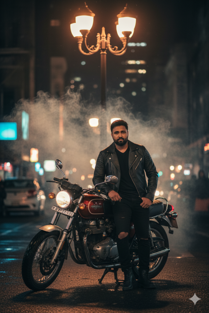 • Prompt: “Young man in leather jacket, leaning against a motorbike under streetlights, rebellious smirk, smoky night background, cinematic teen K-drama rebel look.”