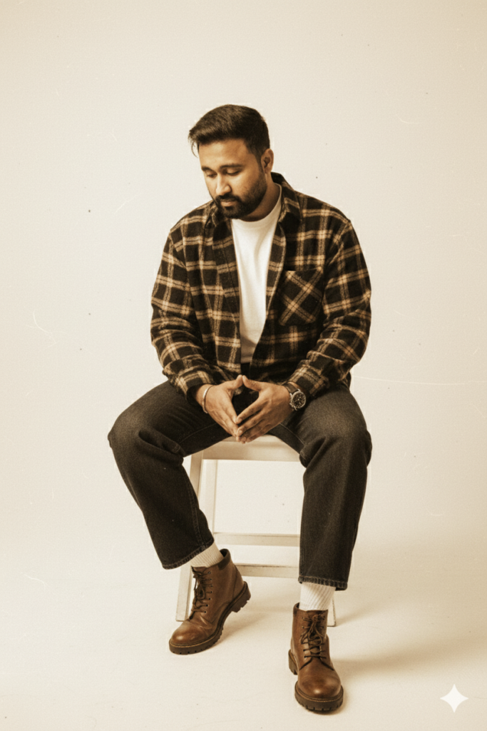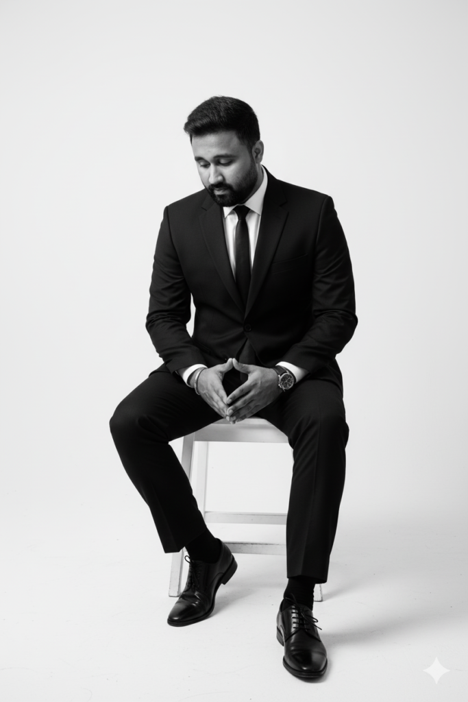 • Prompt: “Black and white artistic portrait of a man, with a fashionable model dressed in a sophisticated suit, black socks and shoes. He is sitting with a slightly hunched posture, looking down as if lost in thought. His facial features are the same as the original photo, like her hairstyle. It features minimalist accessories that highlight the elegant and editorial tone. The studio’s clean lighting enhances textures and depth, creating an elegant, couture feel. Use the uploaded picture as a reference for the face. Aspect ratio: 4:5 vertical.”