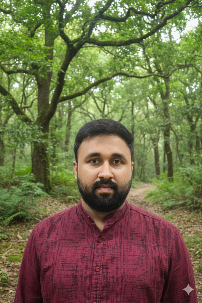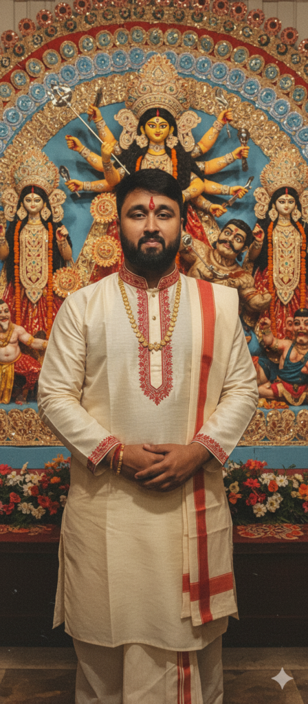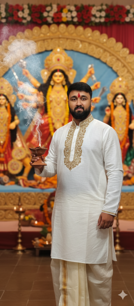 • Prompt: “Generate a portrait showcasing a man in traditional attire holding a decorated plate with puja flowers. Wear a white kurta with red and gold motifs, with a subtle pagri. Blurred Durga idol backdrop with soft diya lighting.”