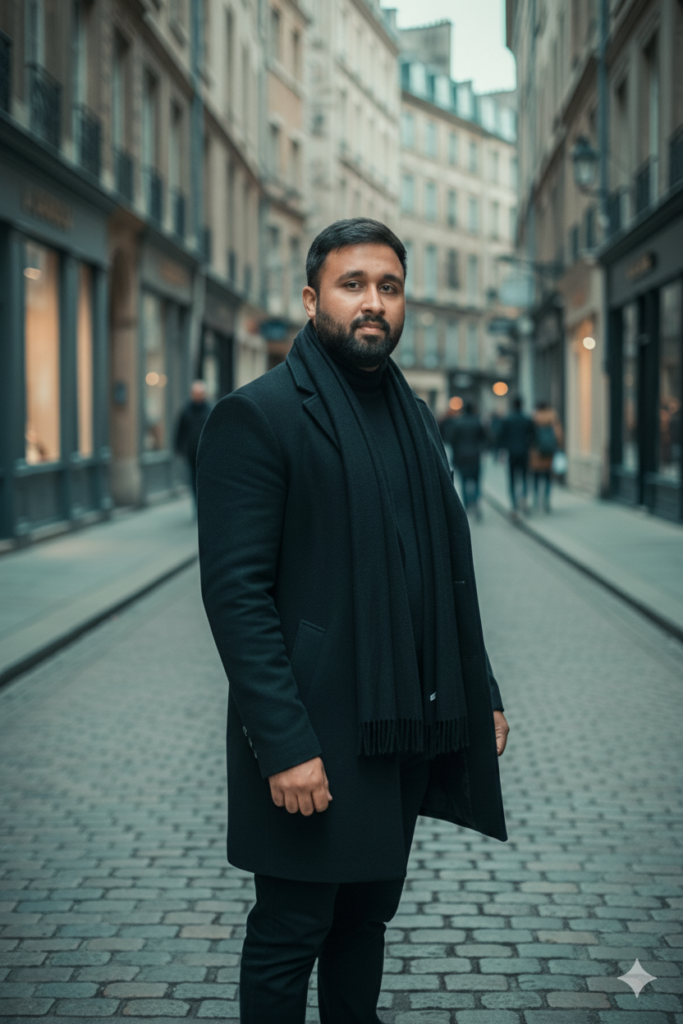 • Prompt: “Ultra-realistic cinematic street portrait in a narrow European city street, tall stone buildings, blurred storefronts, pedestrians as soft silhouettes. Subject standing in the middle of the street, slightly angled, confident gaze. Wearing a black overcoat + black scarf, minimal stylish vibe. Lighting: overcast daylight, smooth shadows, balanced contrast. Colour grading: cinematic teal-orange, soft desaturated background, natural skin tones. Camera: DSLR 85mm lens, f/1.8, medium waist-up shot, vertical 4:5. Style: cinematic editorial, modern, confident, timeless magazine look.”
