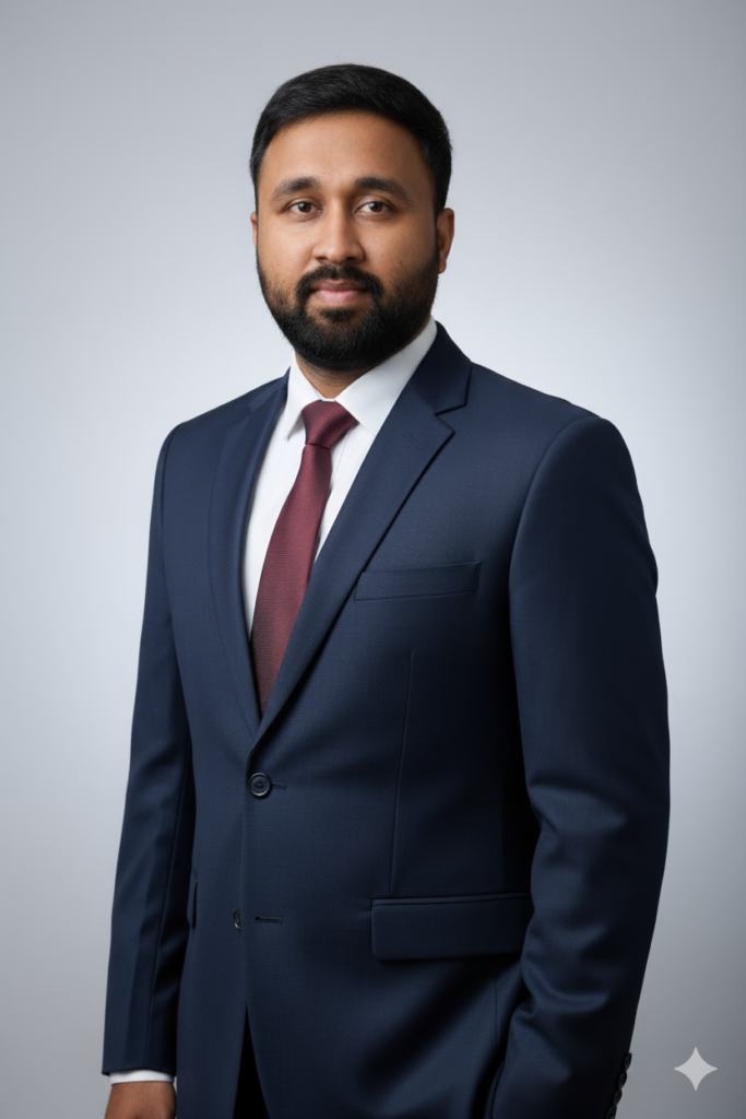 • Prompt: “Corporate professional wearing a formal suit and tie, standing in a clean studio background like a LinkedIn headshot. Keep exact facial features.”