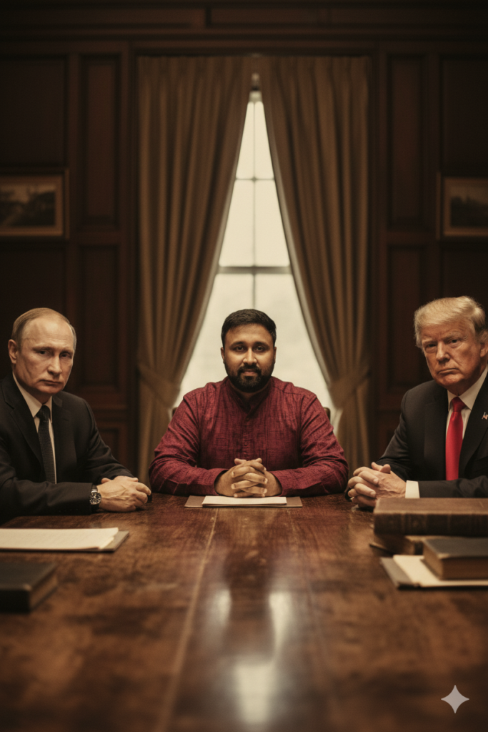 • Prompt: “Create a Cinematic hyper-realistic documentary-style photo. This person in this picture sits confidently between Vladimir Putin and Donald Trump at a rustic wooden table.”